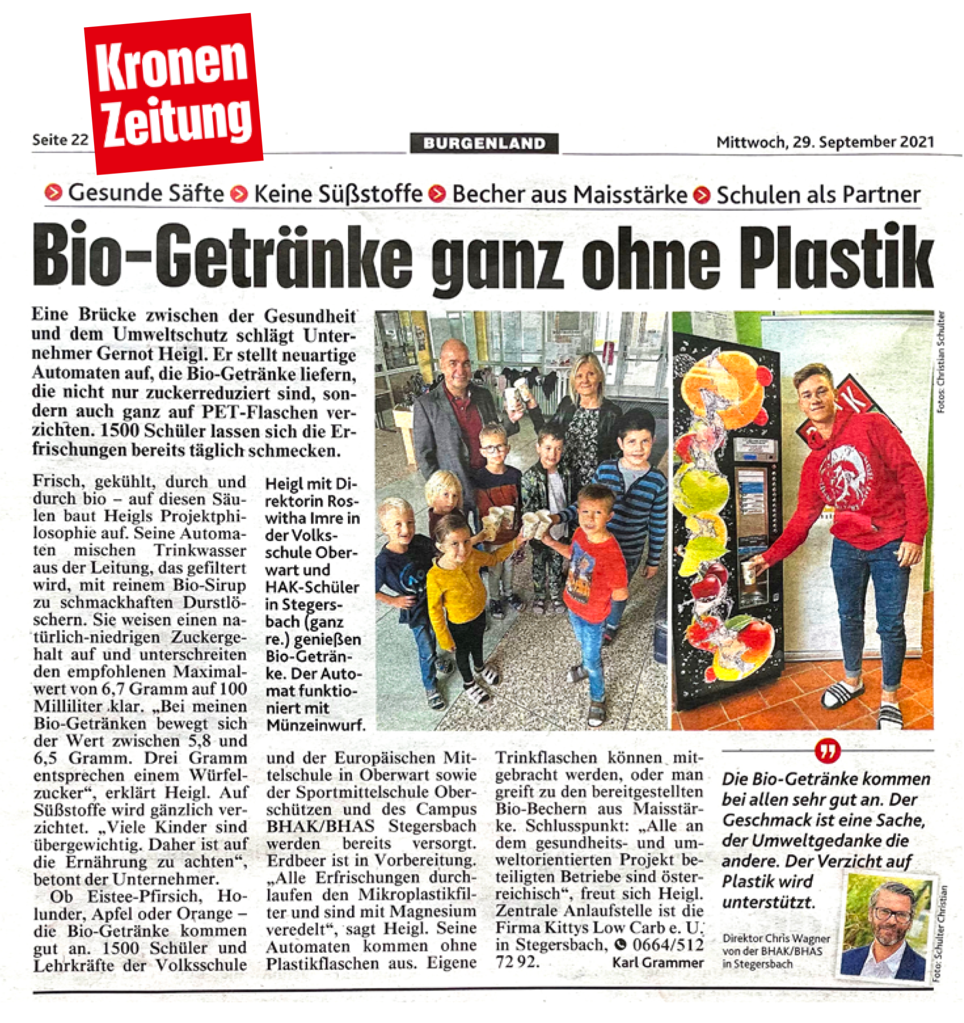 Gemeinsam mit der Landes-Berufsschul-Direktion und der engagierten Lehrlingshaus-Leiterin Verena Binder stellen wir den Lehrlingen zuckerreduzierte BIO-Getränke zur Verfügung, die OHNE Plastik konsumiert werden können. Entweder durch das Befüllen einer mitgebrachten Trinkflasche oder aber in einem automatisch zur Verfügung gestellten BIO-Becher.